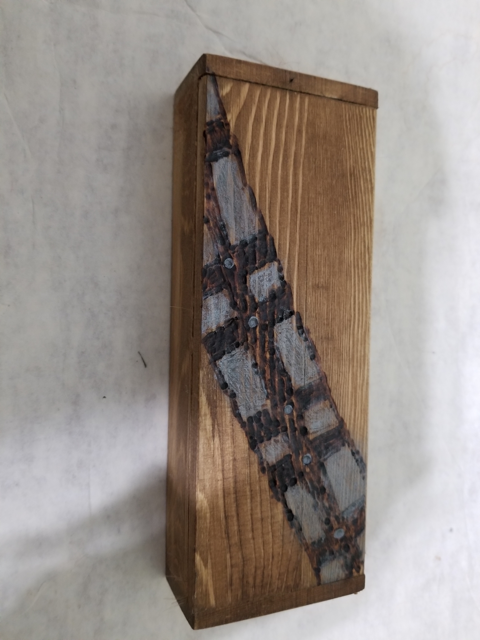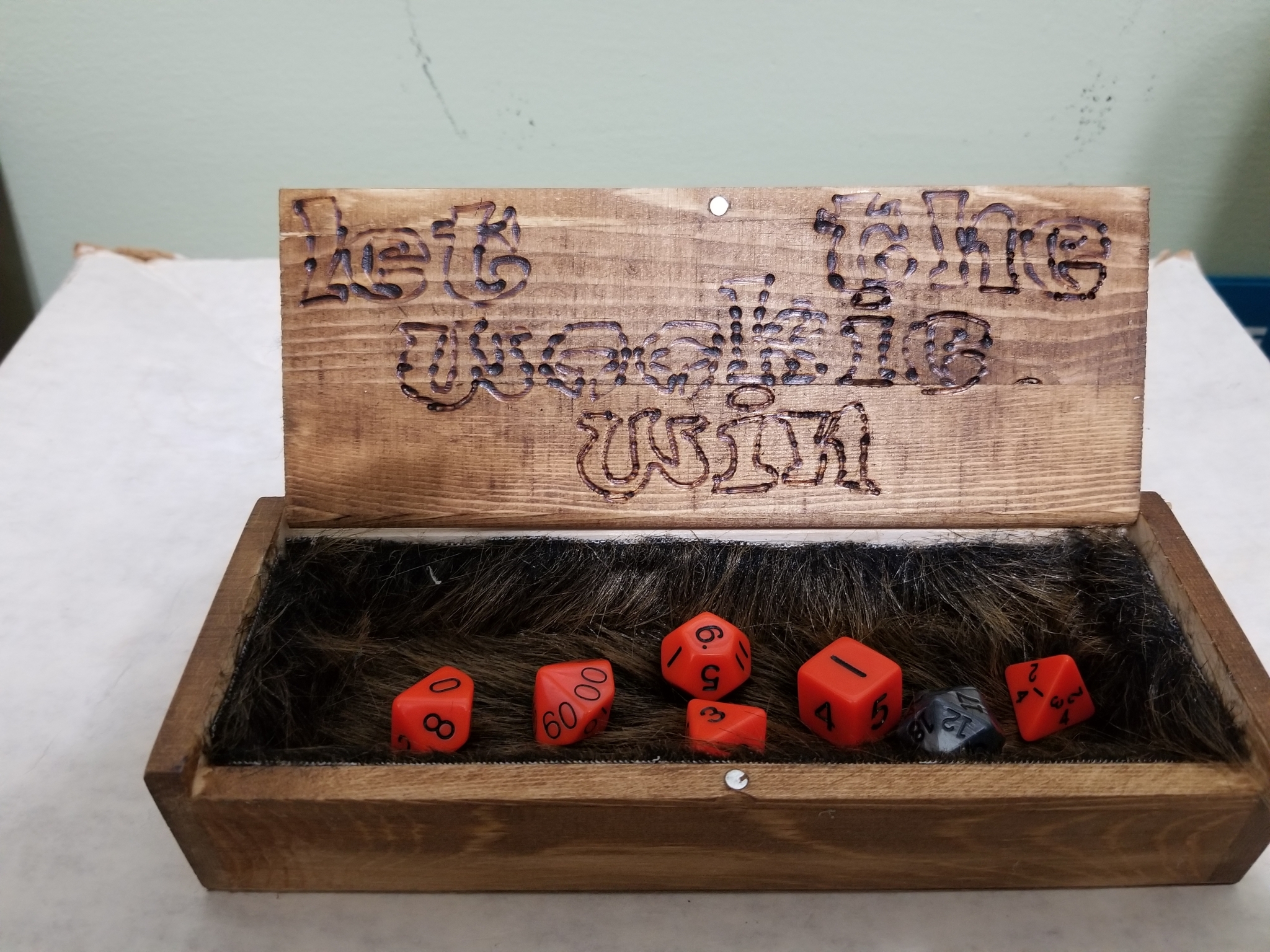 I wood box for storing your dice! Wood burned design on the outside and inside and fur lined. This box is the perfect reminder to always let the wookie win!