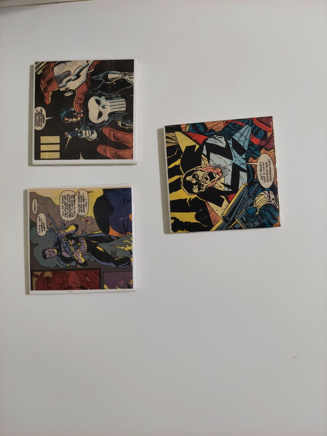 Punisher Comic Book Coasters made from actual comic books! This photo is just for sample use only. Message me for more variety! Can mix and match with other listings to make a set of 4! Listing price is for a set of 4.