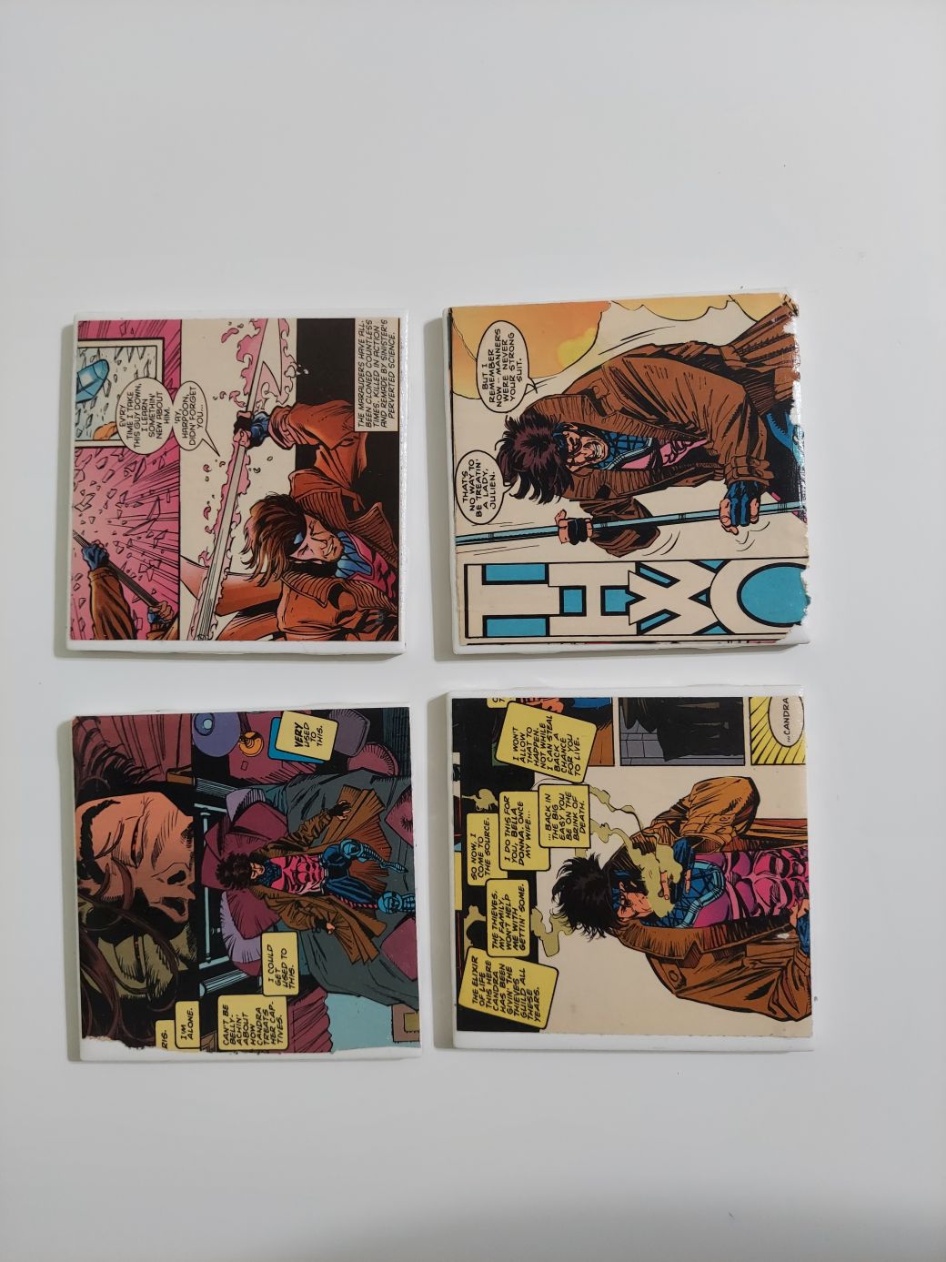 Gambit Comic Book Coasters made from actual comic books! This photo is just for sample use only. Message me for more variety! Can mix and match with other listings to make a set of 4! Listing price is for a set of 4.