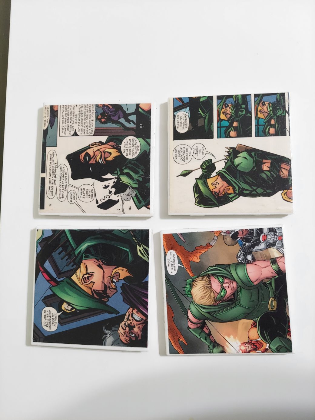 Green Arrow Comic Book Coasters made from actual comic books! This photo is just for sample use only. Message me for more variety! Can mix and match with other listings to make a set of 4! Listing price is for a set of 4.