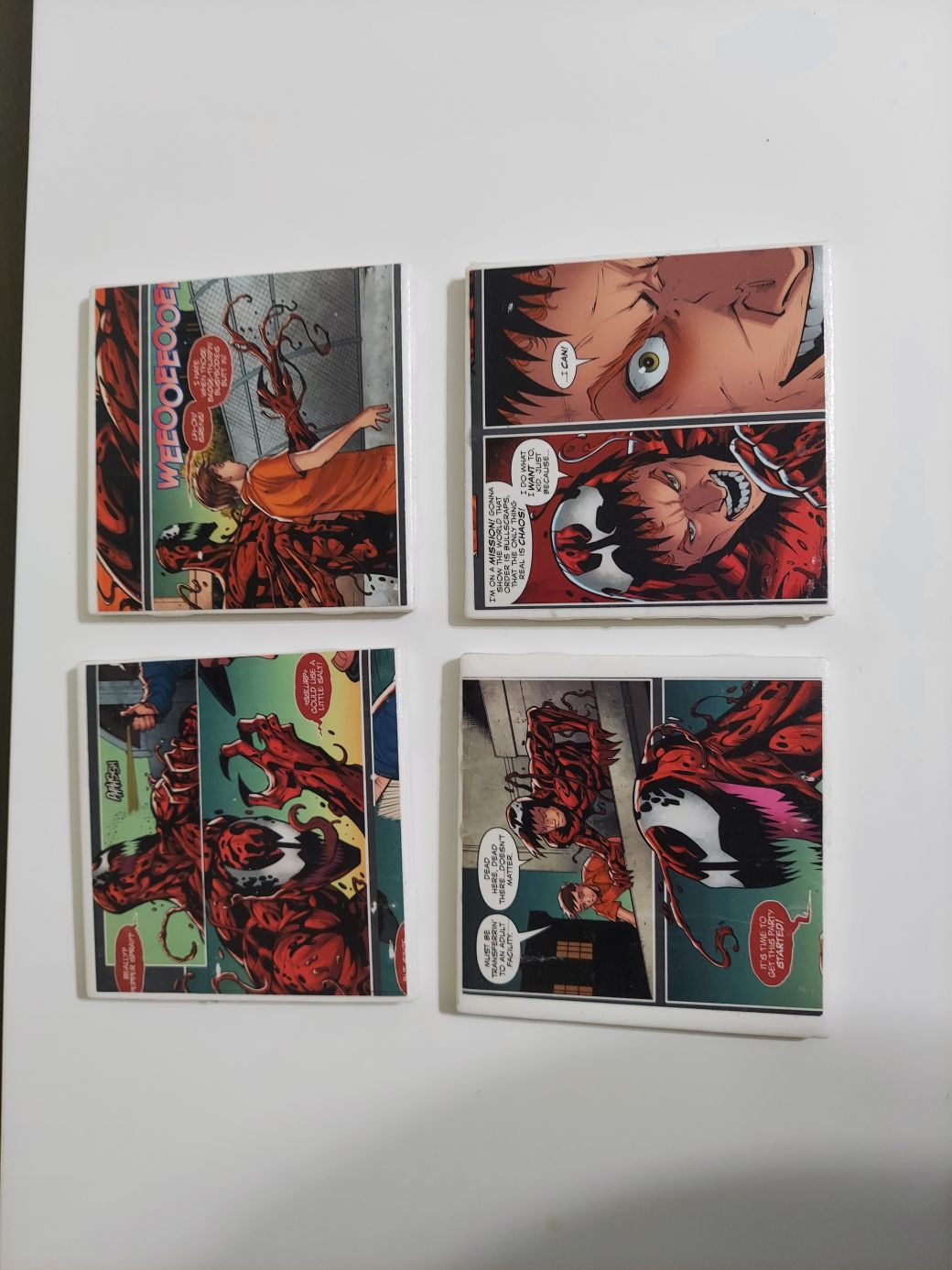 Carnage Comic Book Coasters made from actual comic books! This photo is just for sample use only. Message me for more variety! Can mix and match with other listings to make a set of 4! Listing price is for a set of 4.