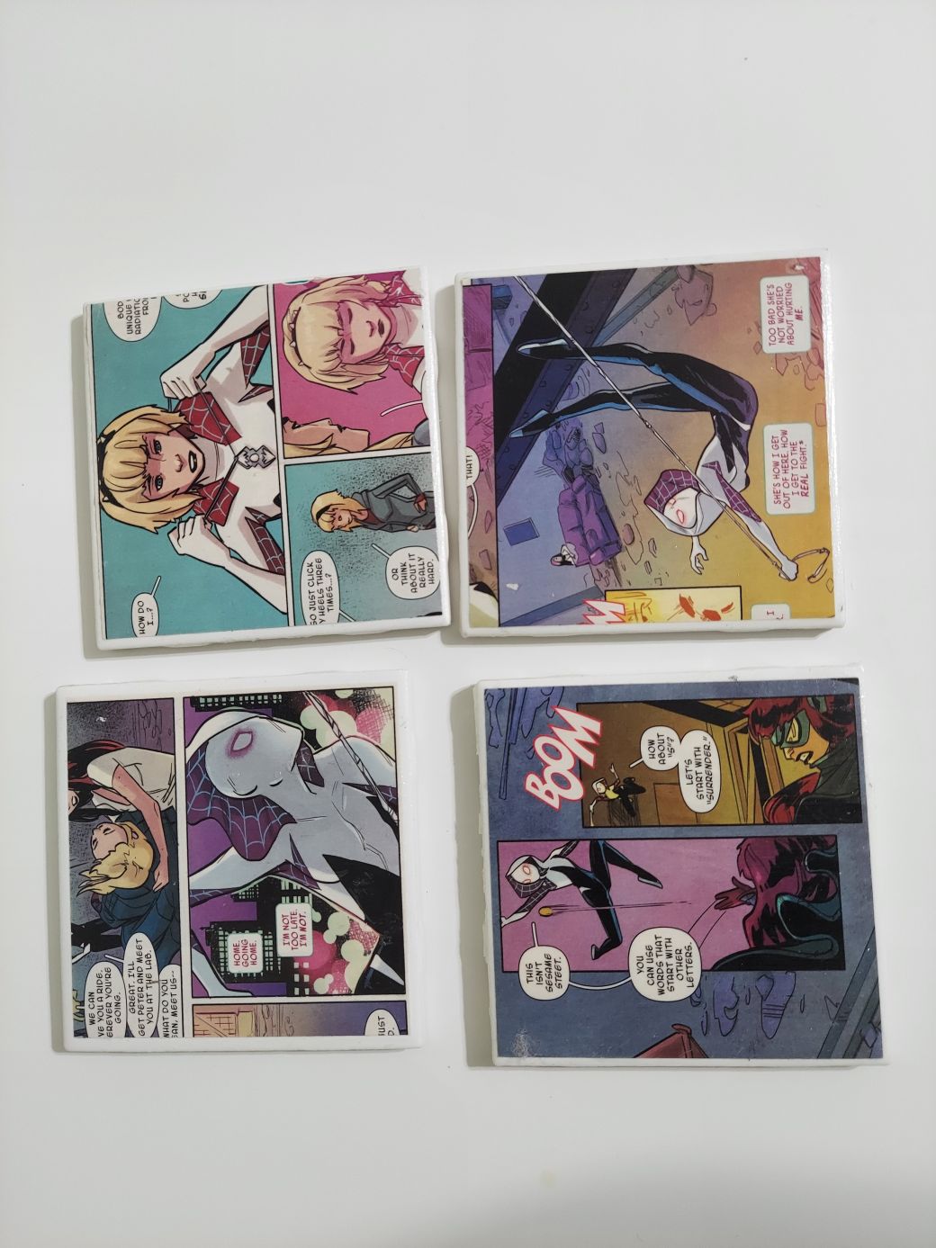 Spider Gwen Comic Book Coasters made from actual comic books! This photo is just for sample use only. Message me for more variety! Can mix and match with other listings to make a set of 4! Listing price is for a set of 4.