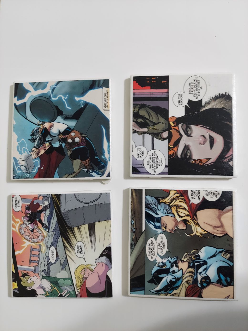 Thor and Loki Comic Book Coasters made from actual comic books! This photo is just for sample use only. Message me for more variety! Can mix and match with other listings to make a set of 4! Listing price is for a set of 4.