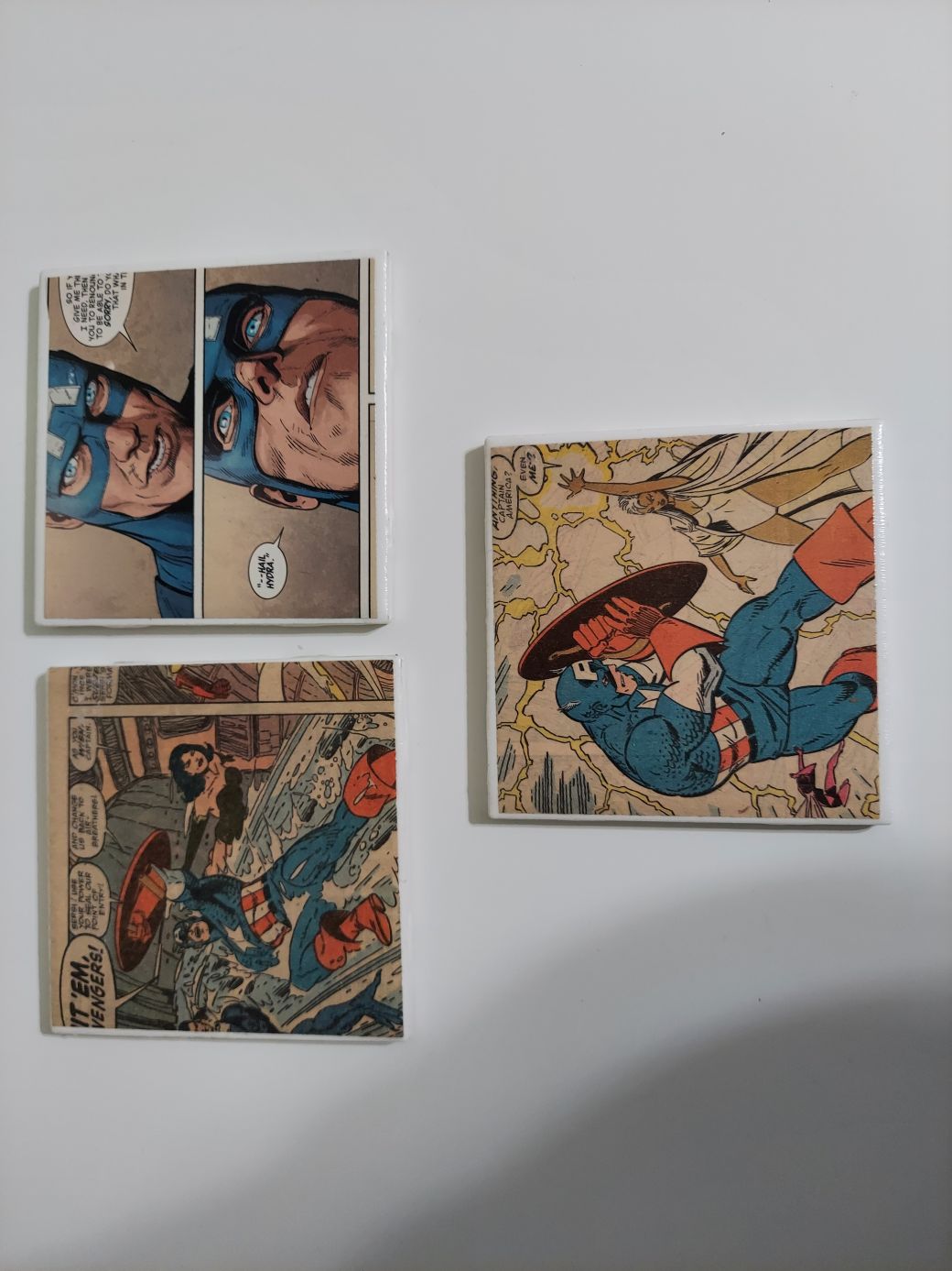 Captain America Comic Book Coasters made from actual comic books! This photo is just for sample use only. Message me for more variety! Can mix and match with other listings to make a set of 4! Listing price is for a set of 4.