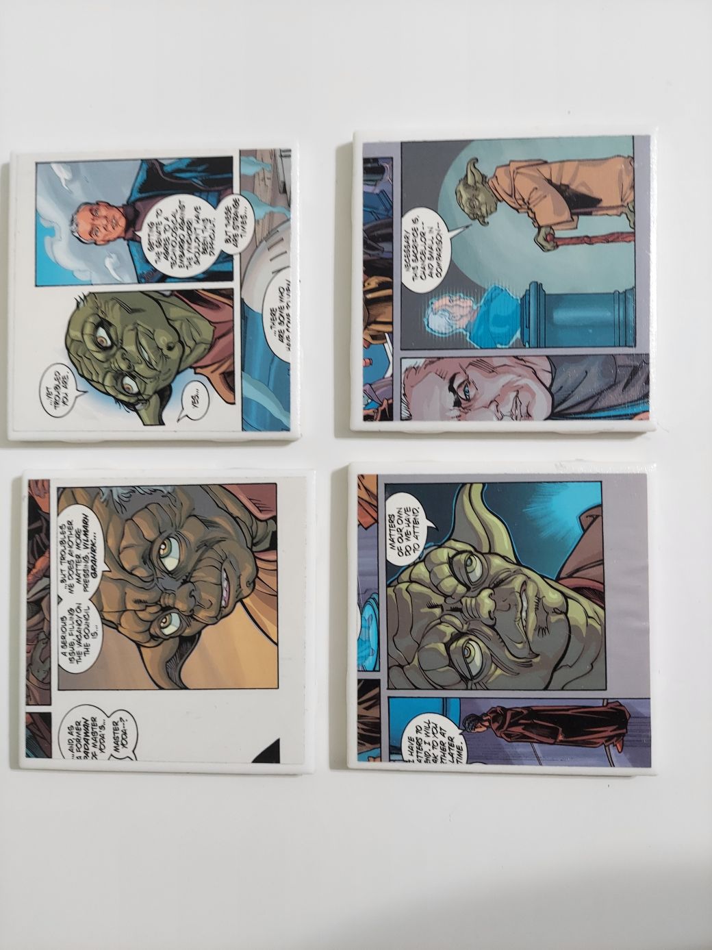 Yoda Comic Book Coasters made from actual comic books! This photo is just for sample use only. Message me for more variety! Can mix and match with other listings to make a set of 4! Listing price is for a set of 4.