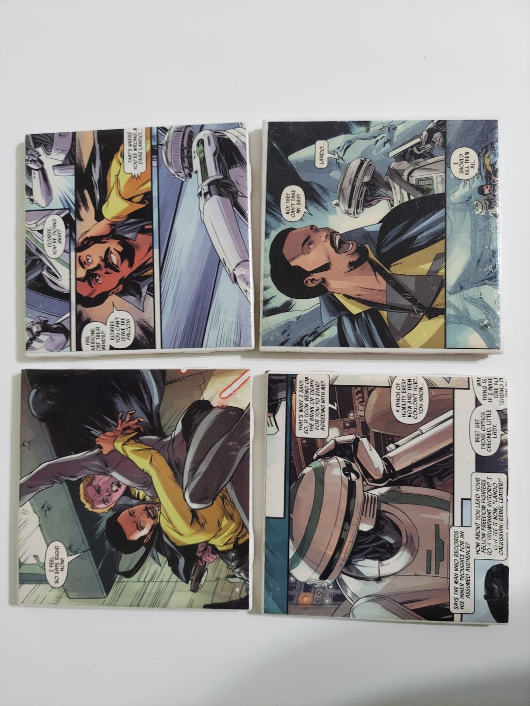 New Lando Comic Book Coasters made from actual comic books! This photo is just for sample use only. Message me for more variety! Can mix and match with other listings to make a set of 4! Listing price is for a set of 4.