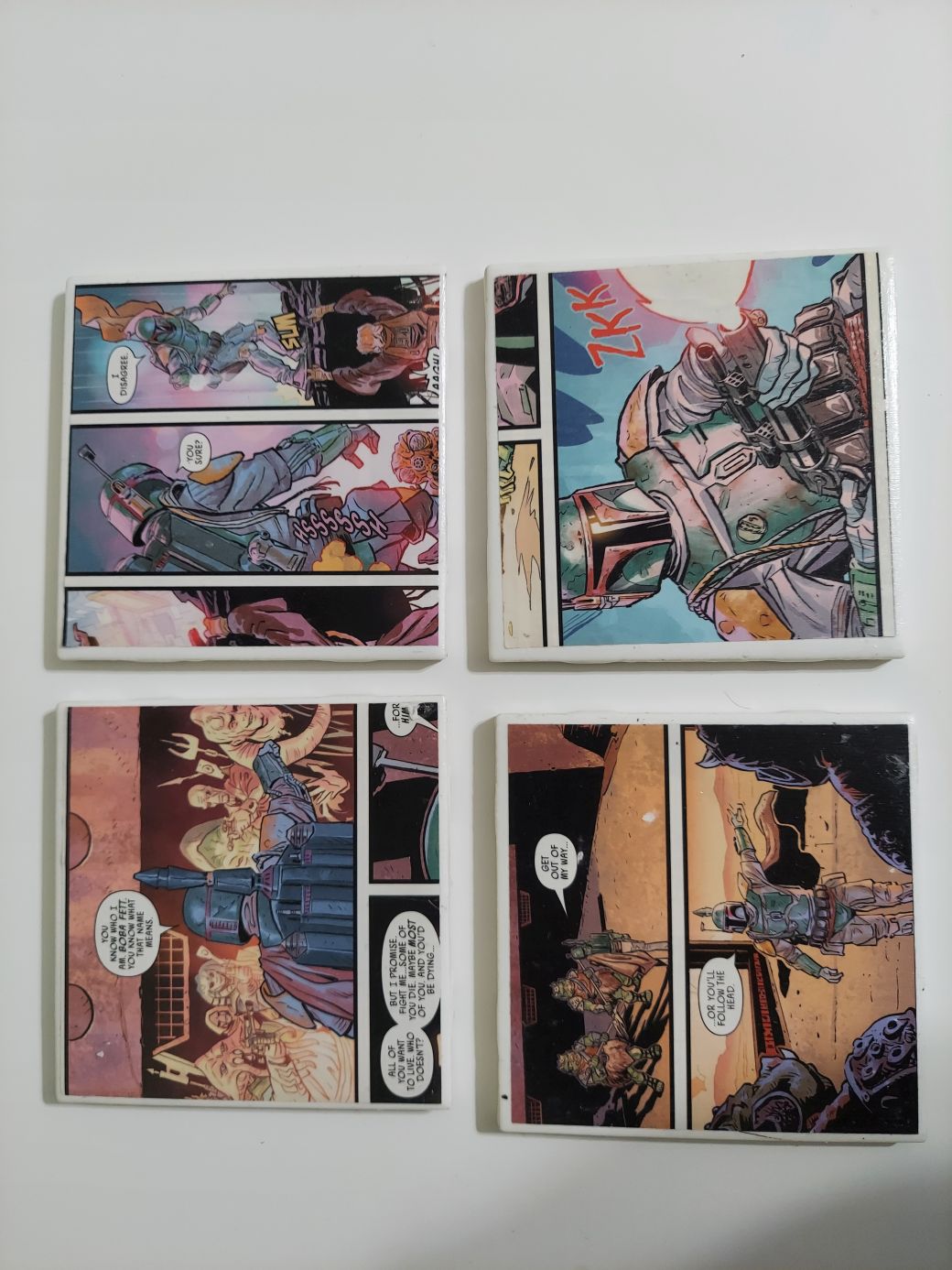 Boba Fett Comic Book Coasters made from actual comic books! This photo is just for sample use only. Message me for more variety! Can mix and match with other listings to make a set of 4! Listing price is for a set of 4.