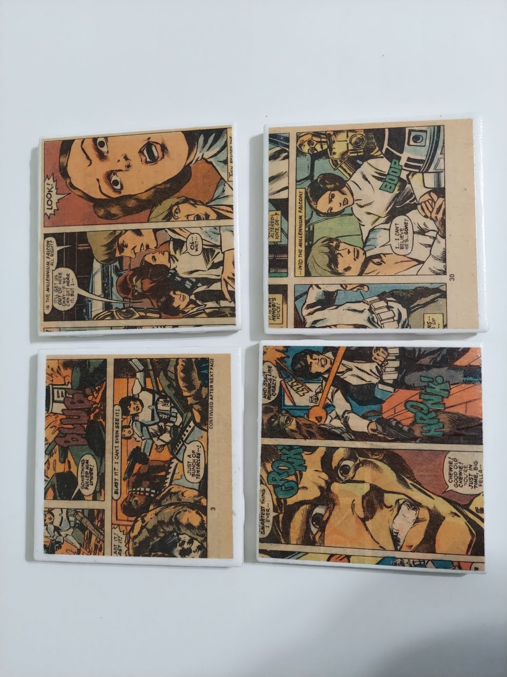 Old School Star Wars Comic Book Coasters made from actual comic books! This photo is just for sample use only. Message me for more variety! Can mix and match with other listings to make a set of 4! Listing price is for a set of 4.