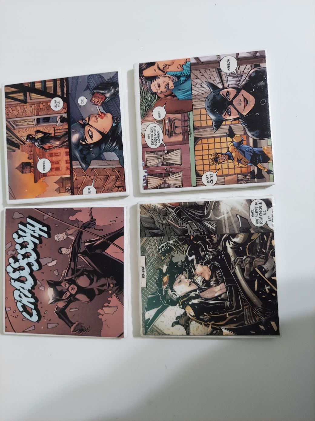 Cat Woman Comic Book Coasters made from actual comic books! This photo is just for sample use only. Message me for more variety! Can mix and match with other listings to make a set of 4! Listing price is for a set of 4.