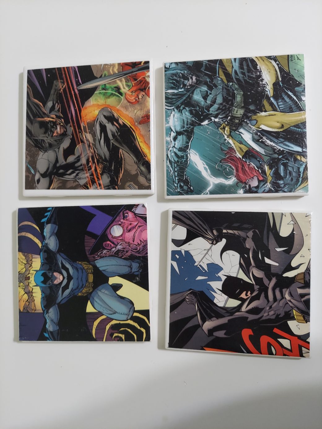Bat Man Comic Book Coasters made from actual comic books! This photo is just for sample use only. Message me for more variety! Can mix and match with other listings to make a set of 4! Listing price is for a set of 4.