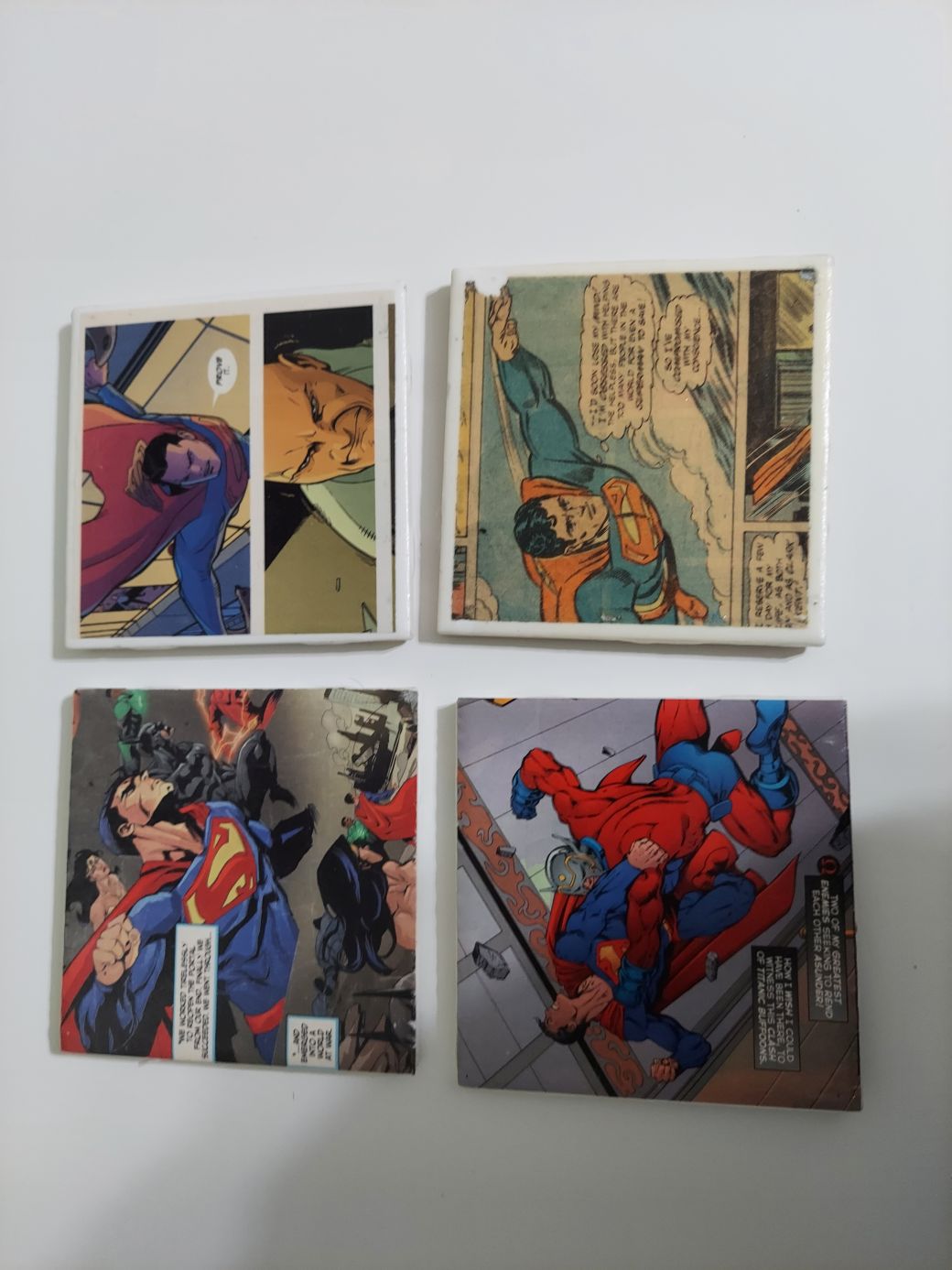 Super Man Comic Book Coasters made from actual comic books! This photo is just for sample use only. Message me for more variety! Can mix and match with other listings to make a set of 4! Listing price is for a set of 4.