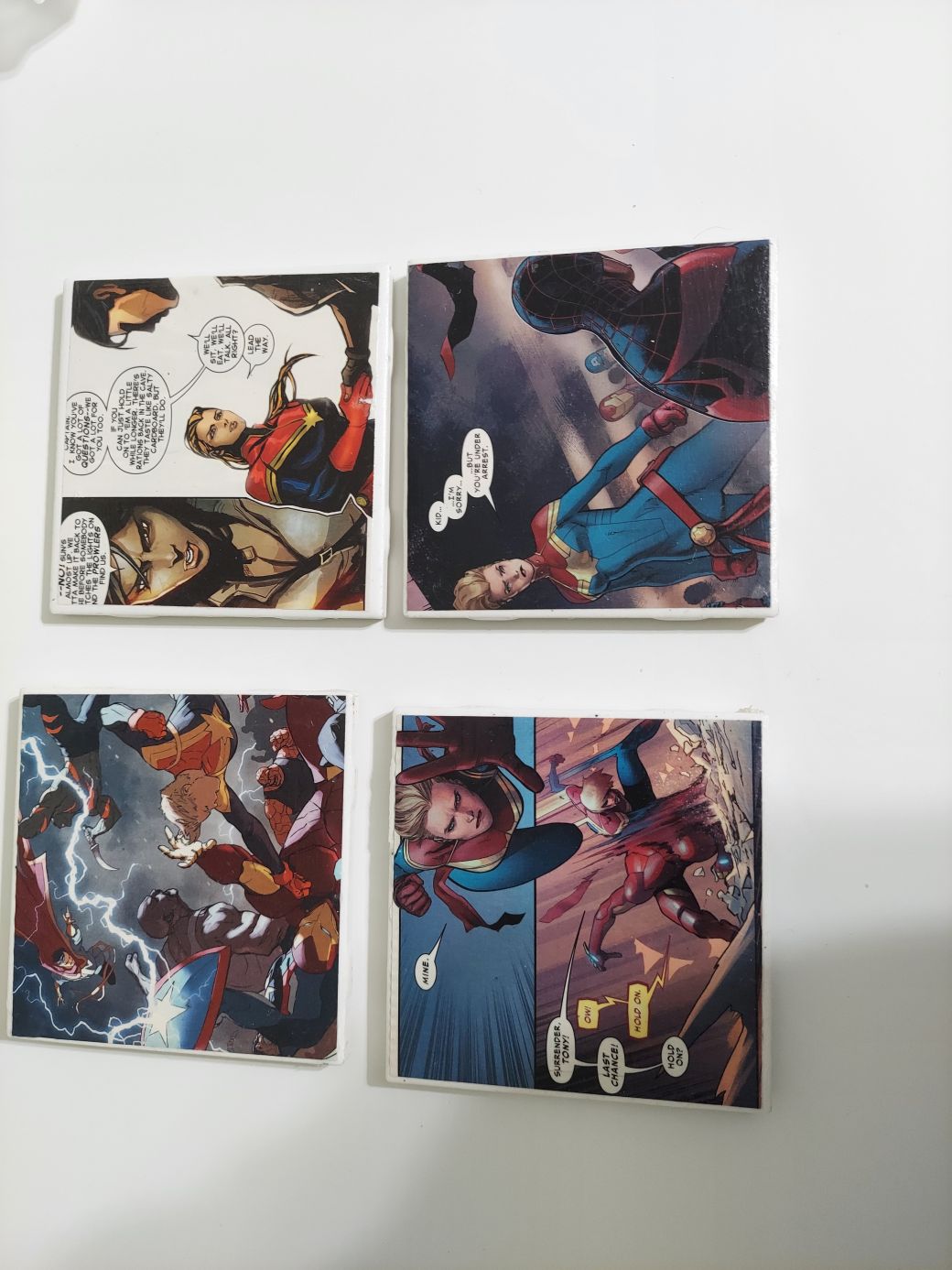 Captain Marvel Comic Book Coasters made from actual comic books! This photo is just for sample use only. Message me for more variety! Can mix and match with other listings to make a set of 4! Listing price is for a set of 4.
