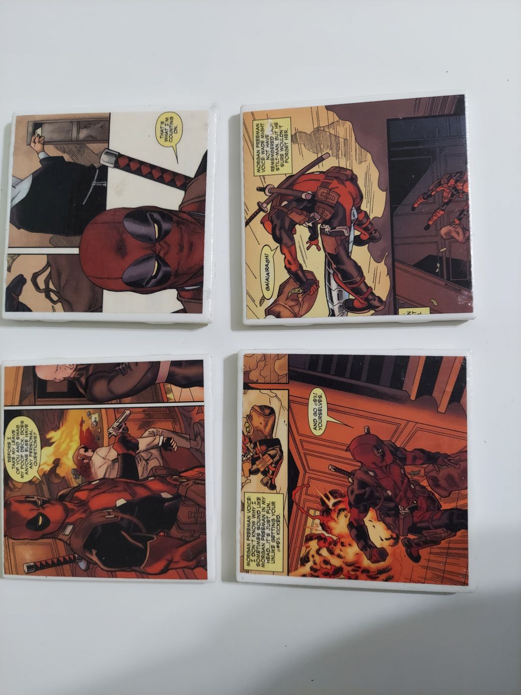 Dead Pool Comic Book Coasters made from actual comic books! This photo is just for sample use only. Message me for more variety! Can mix and match with other listings to make a set of 4! Listing price is for a set of 4.