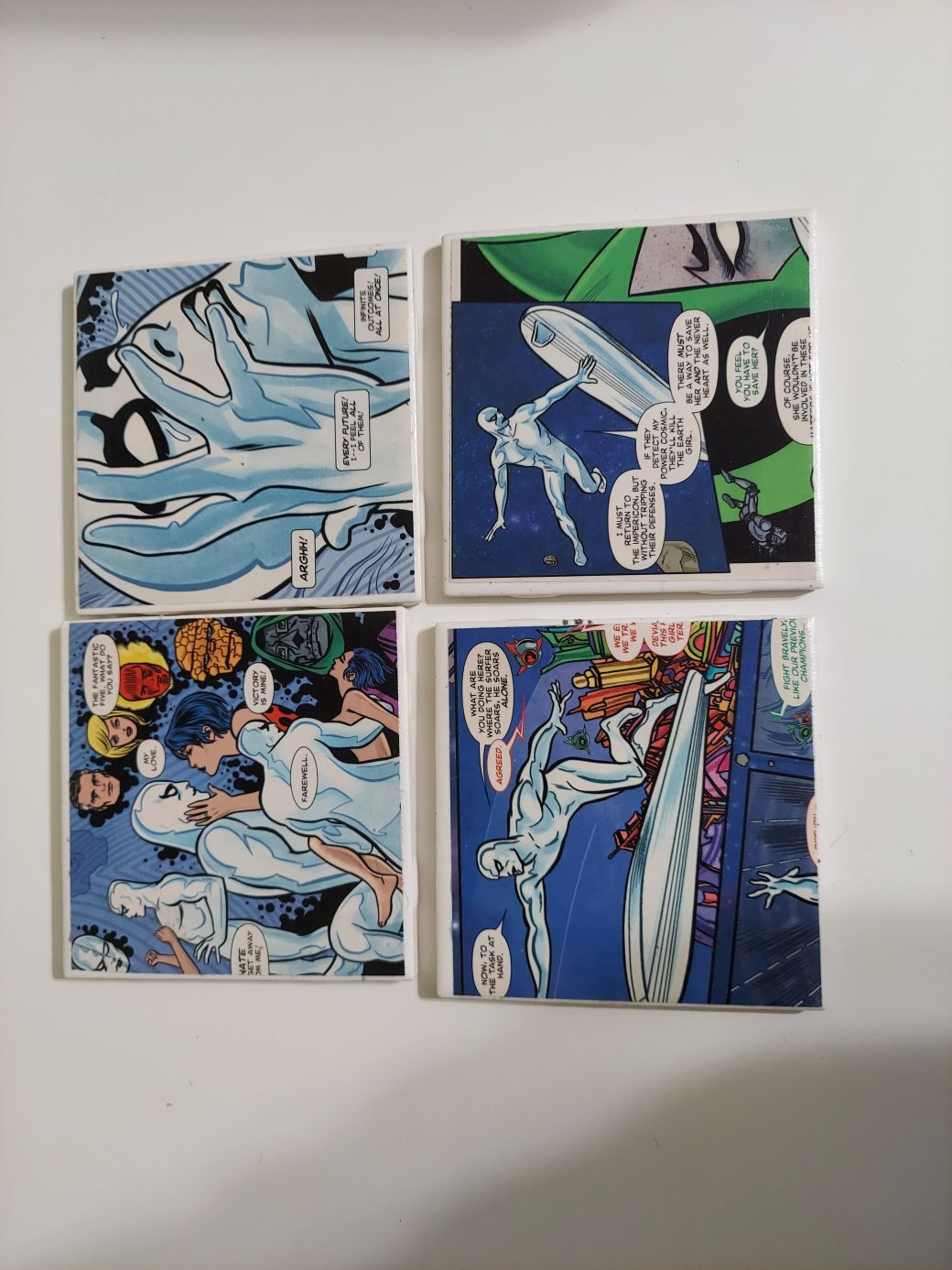 Silver Surfer Comic Book Coasters made from actual comic books! This photo is just for sample use only. Message me for more variety! Can mix and match with other listings to make a set of 4! Listing price is for a set of 4.